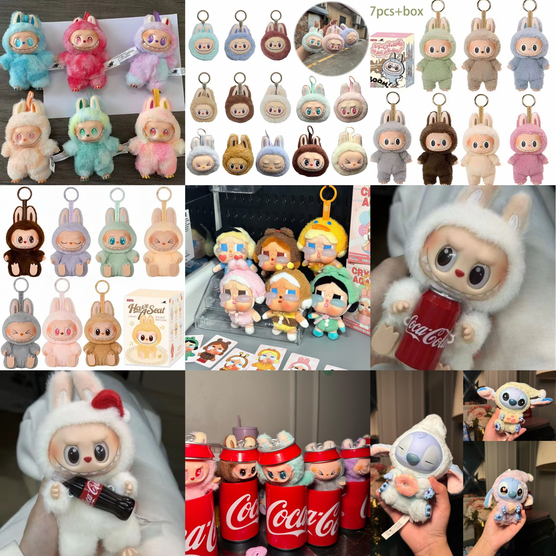 9pc Random labubu bundle9 (Coca-Cola can / Coca-Cola bottle/ colored cola labubu / big into energy/ teethe labubu / excited macaroon/ have a seat / crying doll/ stitch )
