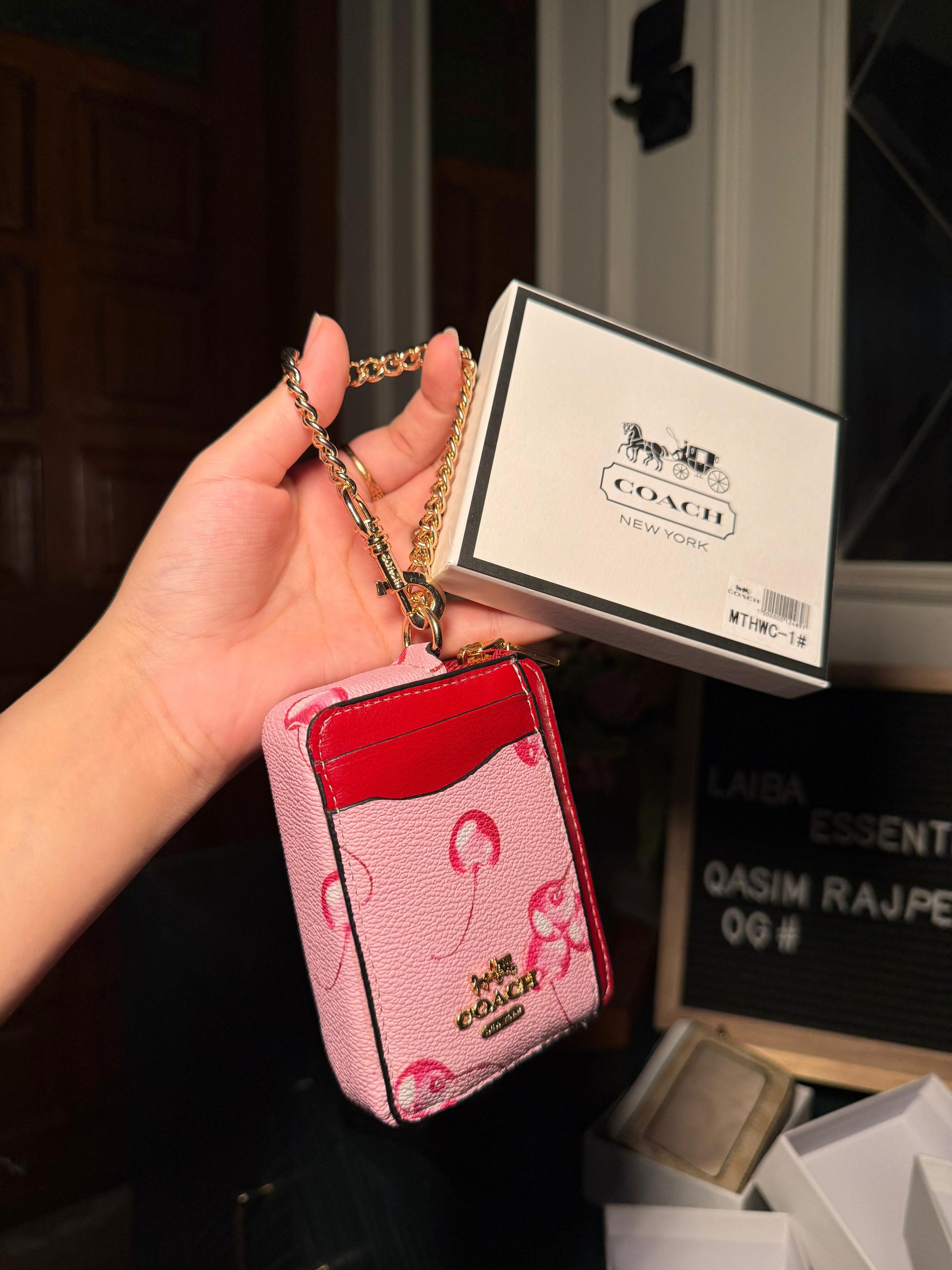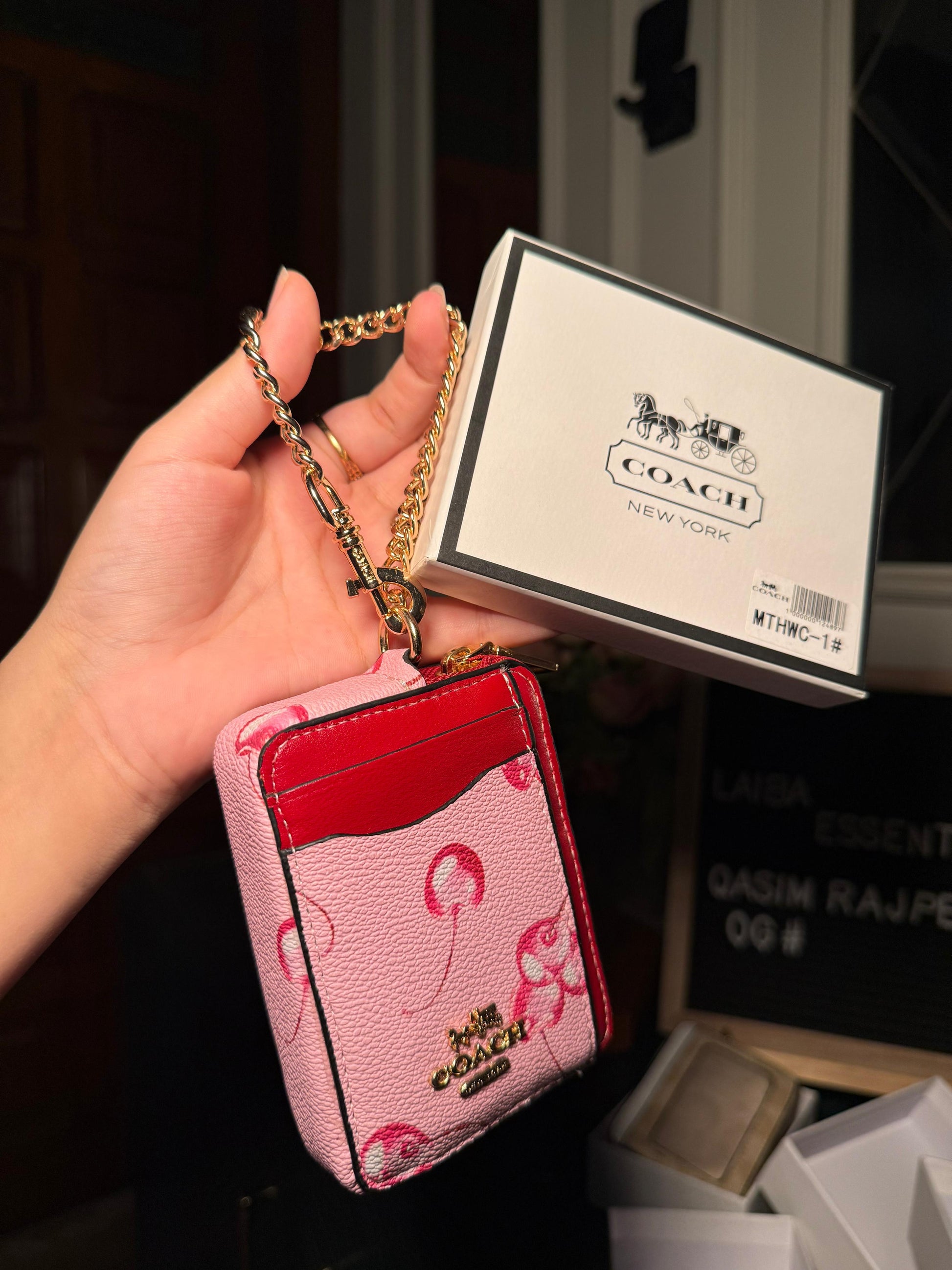 Coach Pink Cherry Print with Red Trim Mini ID/Key Pouch WITH BOX