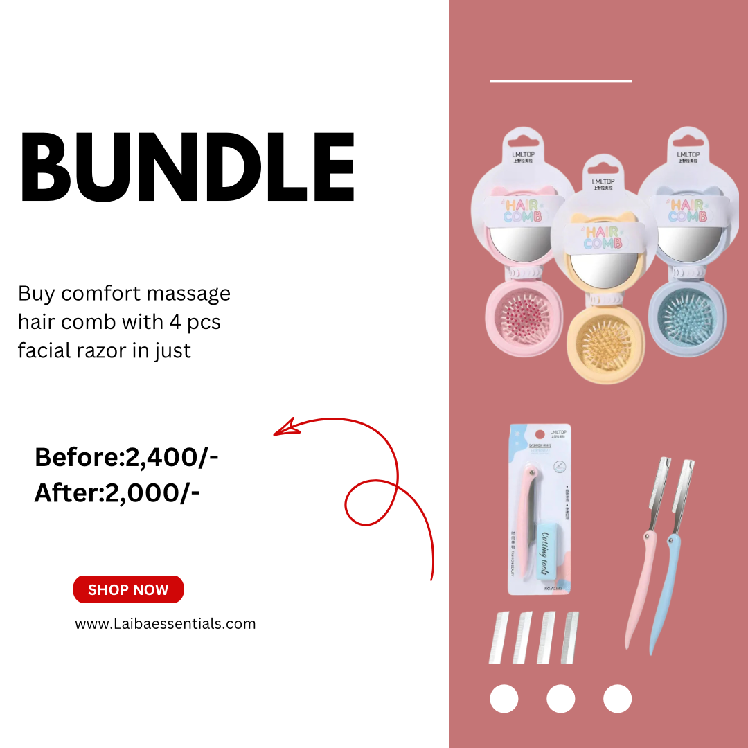 Buy the comfort massage hair comb along with 4 pcs facial razor for just 2,000/- (originally 2,400/-). This combo is perfect for a little self-care pampering session at home. The massage hair comb will help you relax while taking care of your hair, and the facial razors will keep your skin smooth and glowing. Treat yourself to this affordable bundle to feel refreshed and rejuvenated!
