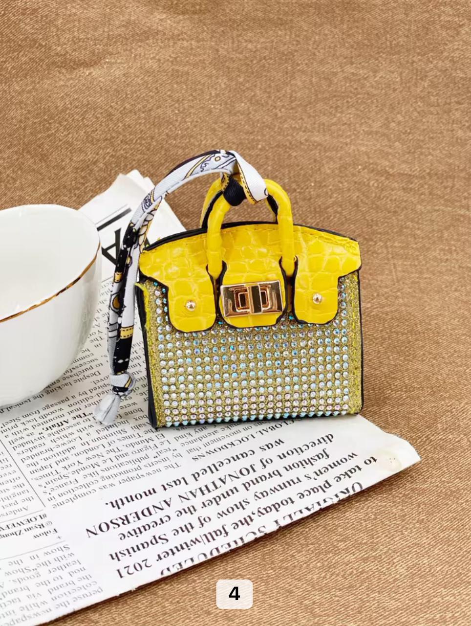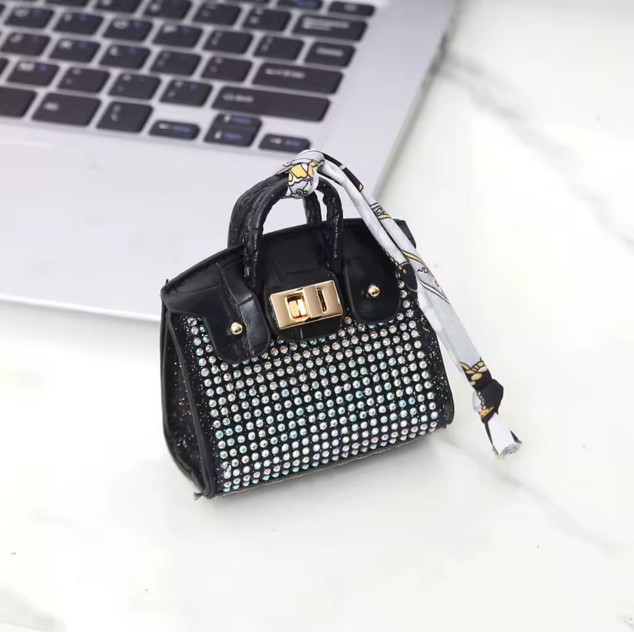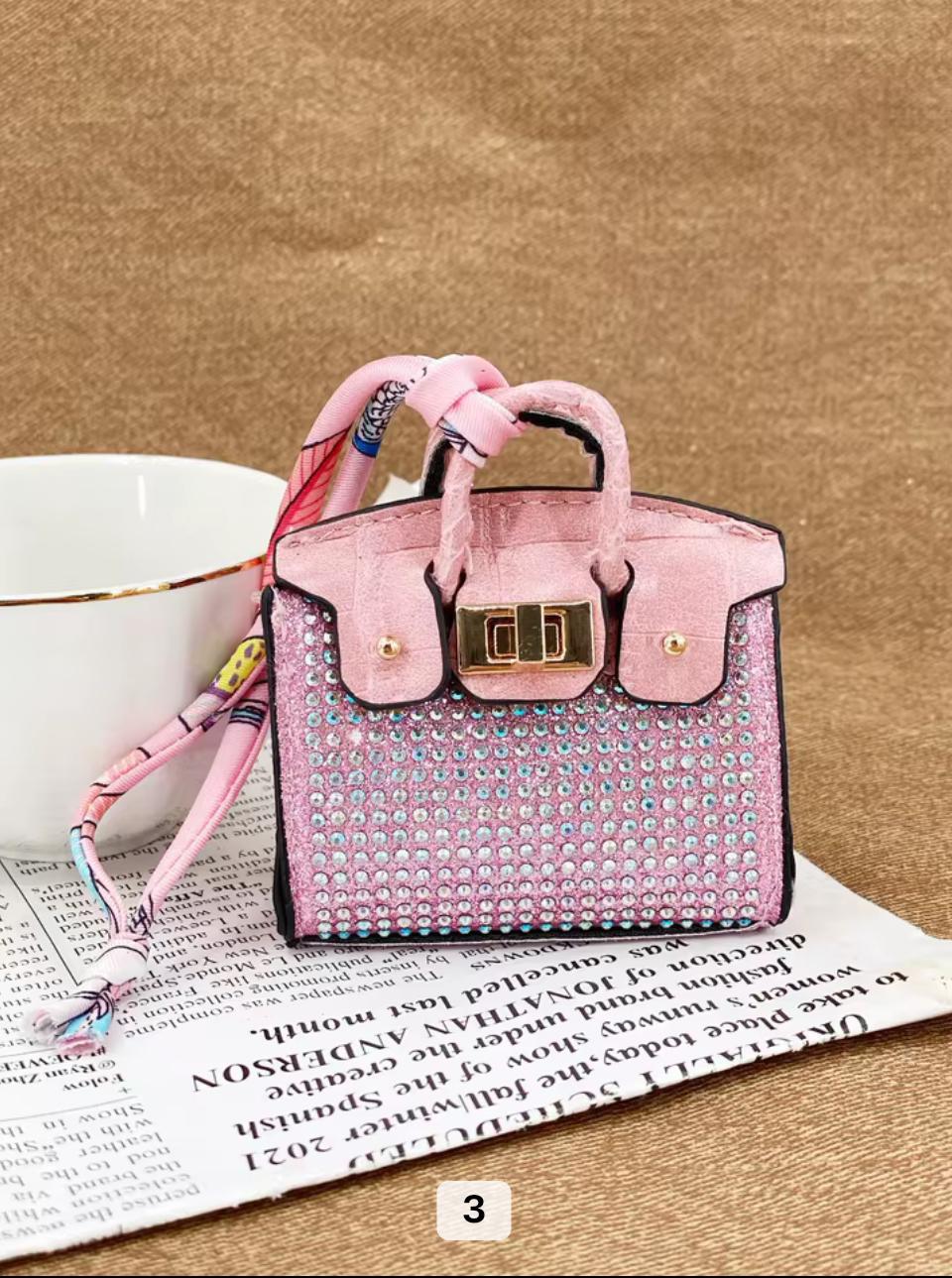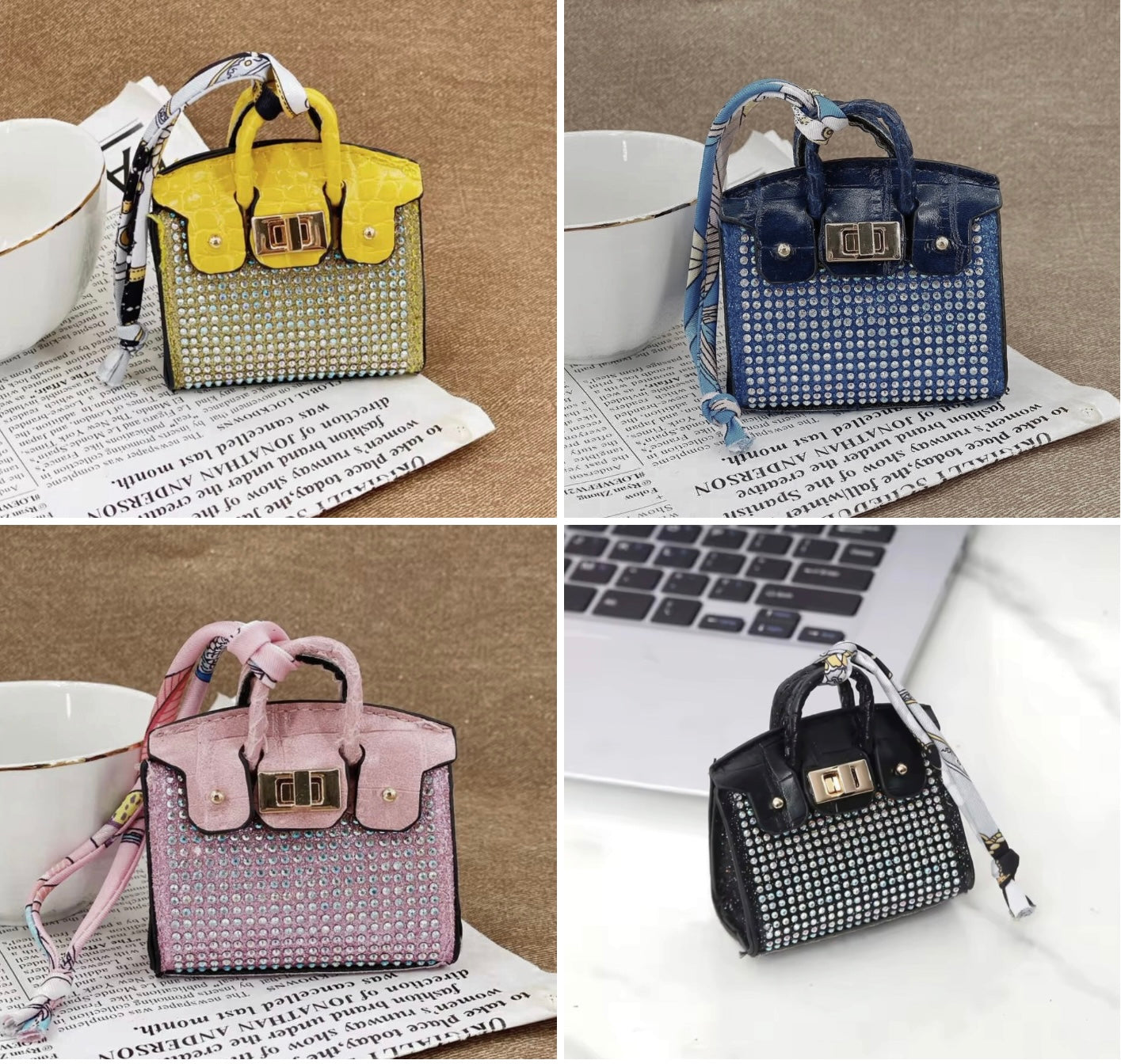 Faux leather with rhinestones and matching printed handle scarf birkin bag charm key chain