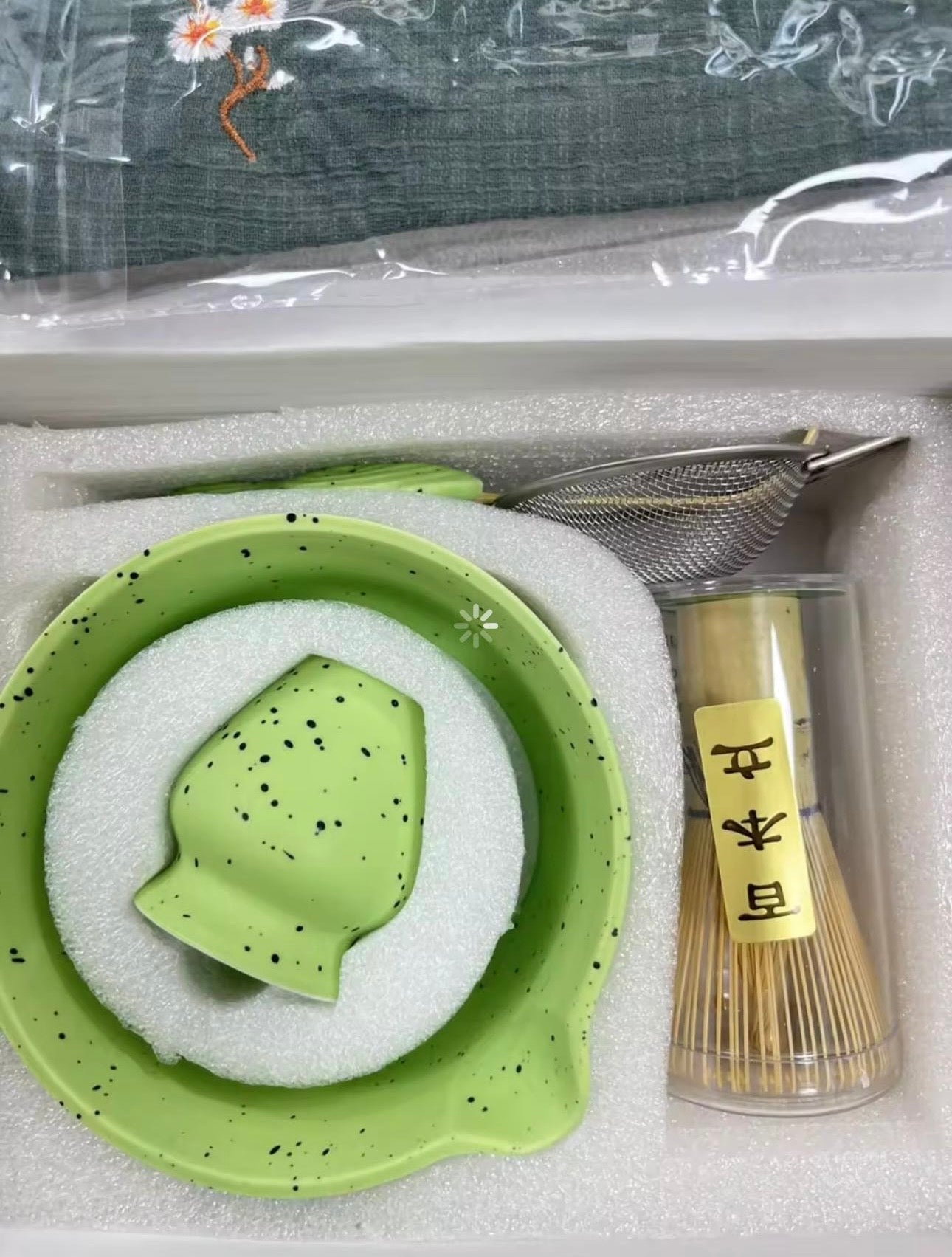- *Additional Accessories*: Includes a small ceramic container and bamboo whisk