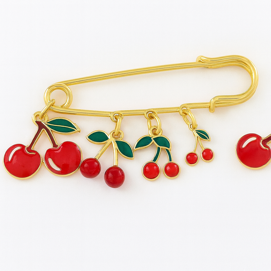Cherry Charm Safety Pin BroochAdd a touch of sweetness to your style with our Cherry Charm Safety Pin Brooch. Featuring multiple cherry charms in vibrant red enamel with glossy green leaves, this brooch is designed with a gold-tone safety pin that makes it both stylish and versatile.
