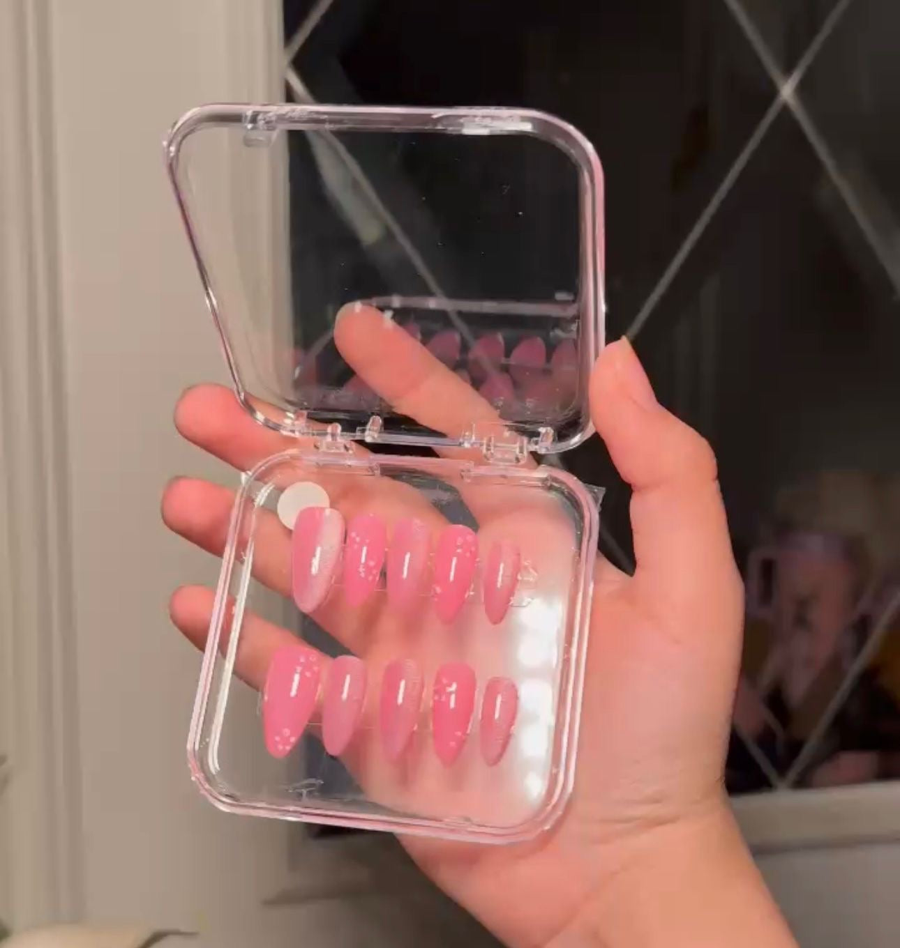 - our stunning collection of handmade press-on nails! Each set is meticulously crafted with love and attention to detail, ensuring a perfect fit and an eye-catching design. Our nails are made from high-quality materials, providing durability and a comfortable wear that lasts. Whether you're looking for a chic, elegant look or something bold and vibrant, we have a variety of styles to suit every occasion. Easy to apply and remove, our press-on nails are perfect for anyone who wants to elevate their nail game without the commitment of a salon visit. Get ready to express your unique style and make a statement with our fabulous press-on nails!
