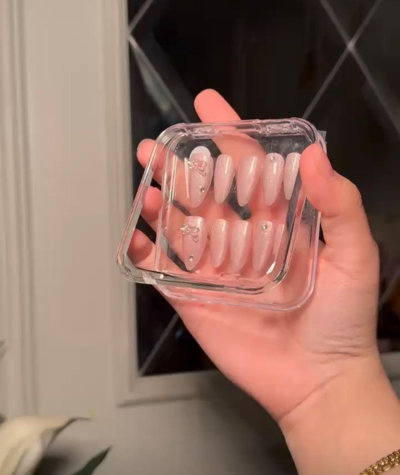 - our stunning collection of handmade press-on nails! Each set is meticulously crafted with love and attention to detail, ensuring a perfect fit and an eye-catching design. Our nails are made from high-quality materials, providing durability and a comfortable wear that lasts. Whether you're looking for a chic, elegant look or something bold and vibrant, we have a variety of styles to suit every occasion. Easy to apply and remove, our press-on nails are perfect for anyone who wants to elevate their nail game without the commitment of a salon visit. Get ready to express your unique style and make a statement with our fabulous press-on nails!