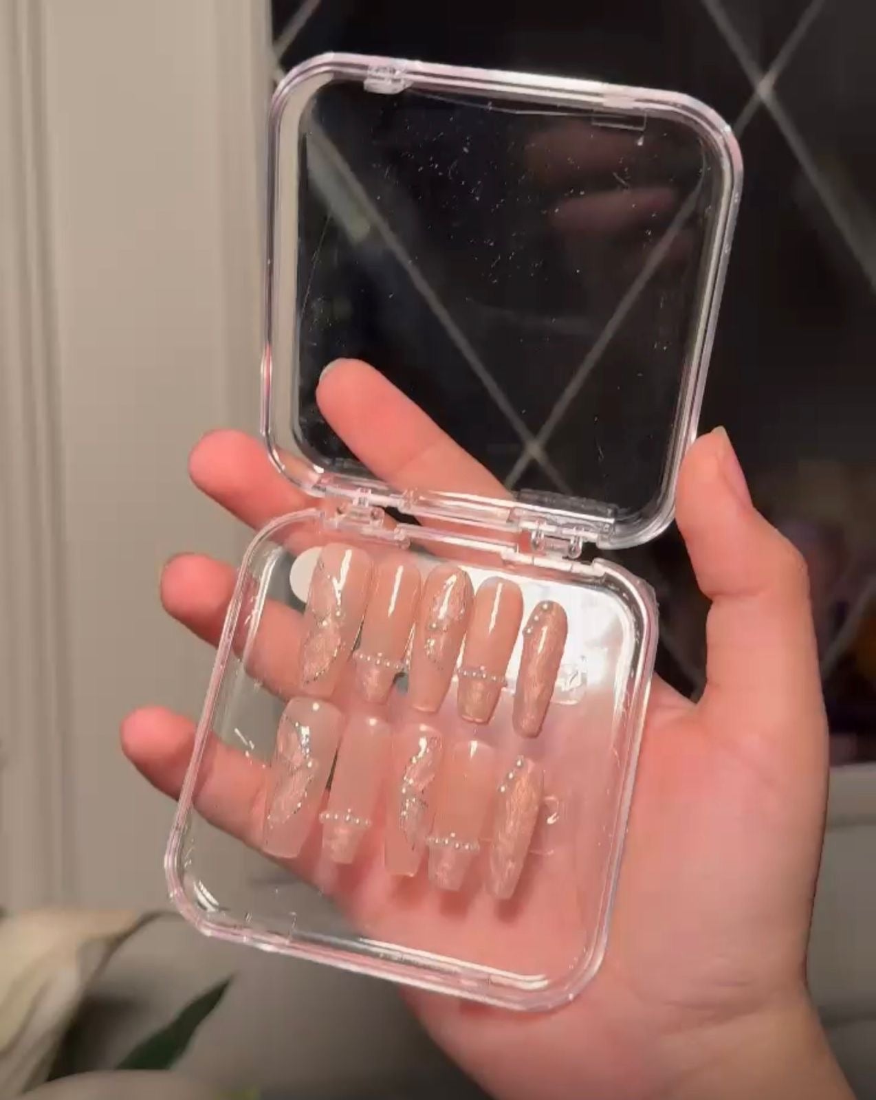 - our stunning collection of handmade press-on nails! Each set is meticulously crafted with love and attention to detail, ensuring a perfect fit and an eye-catching design. Our nails are made from high-quality materials, providing durability and a comfortable wear that lasts. Whether you're looking for a chic, elegant look or something bold and vibrant, we have a variety of styles to suit every occasion. Easy to apply and remove, our press-on nails are perfect for anyone who wants to elevate their nail game without the commitment of a salon visit. Get ready to express your unique style and make a statement with our fabulous press-on nails!