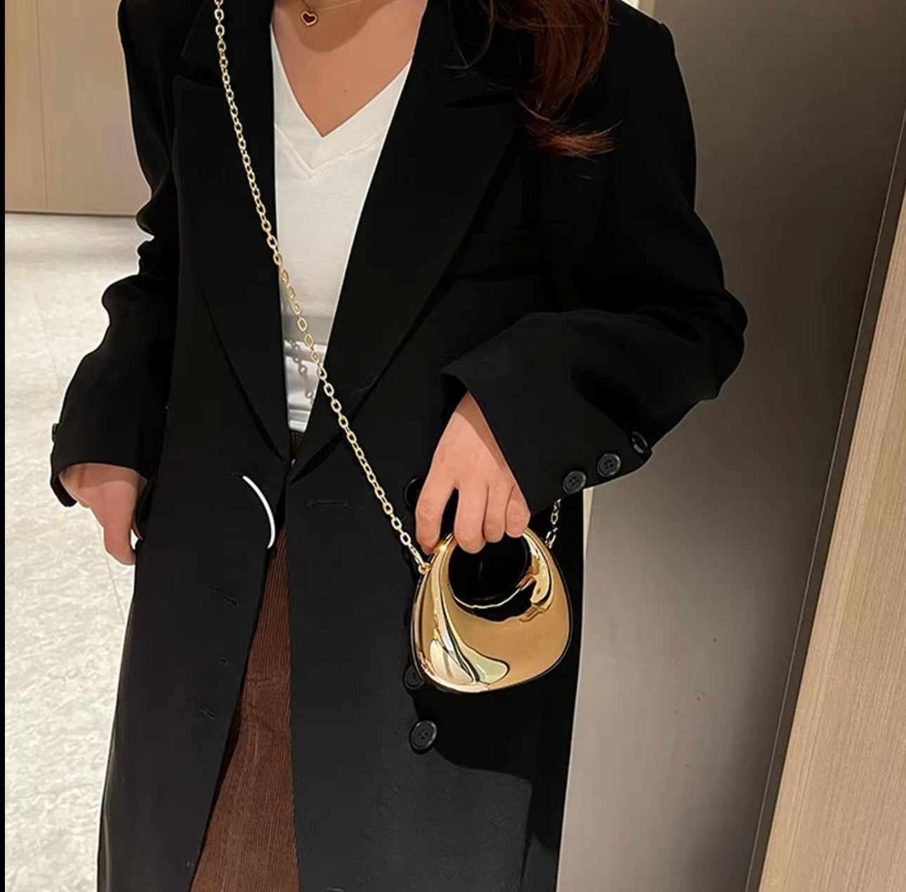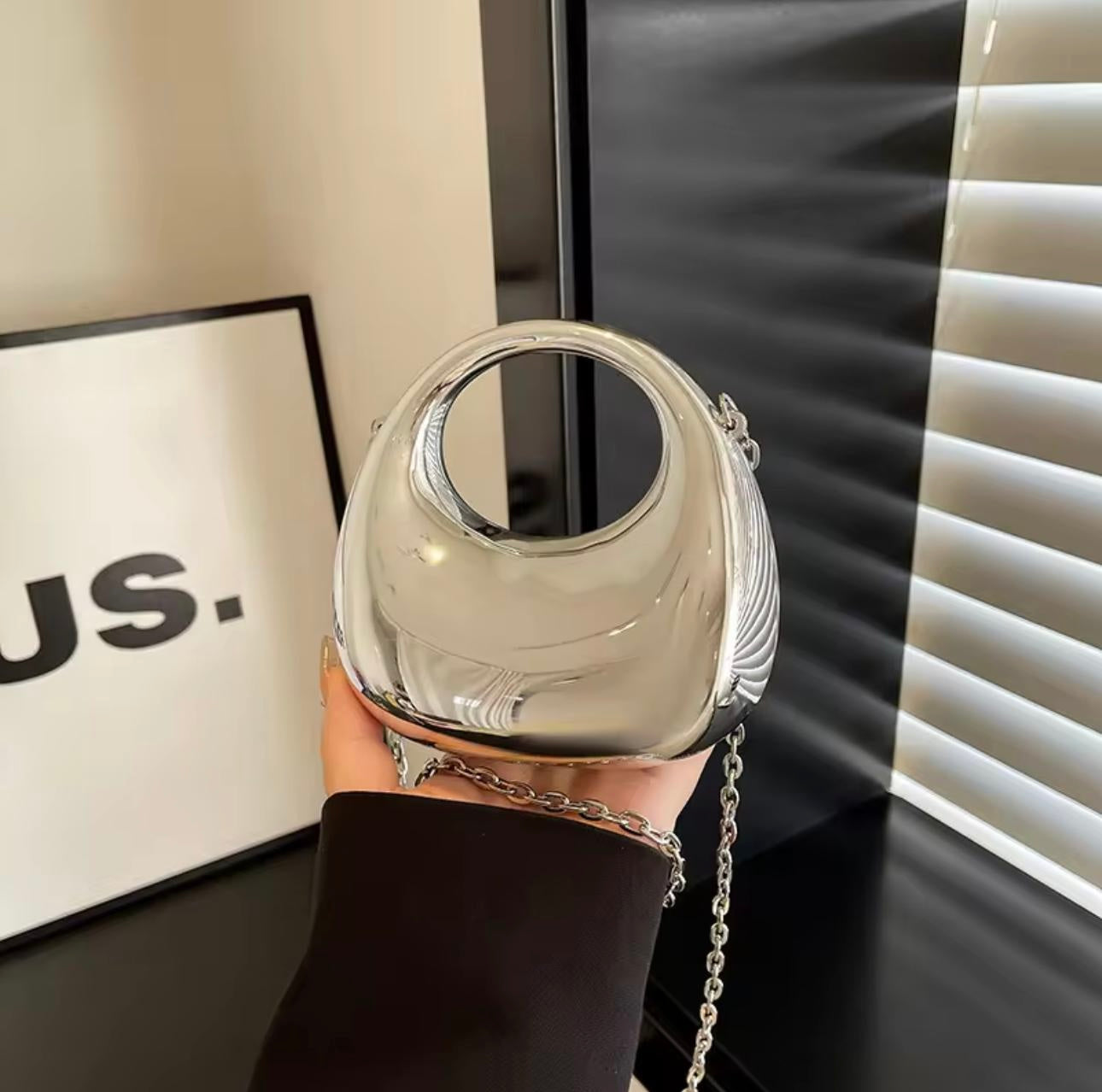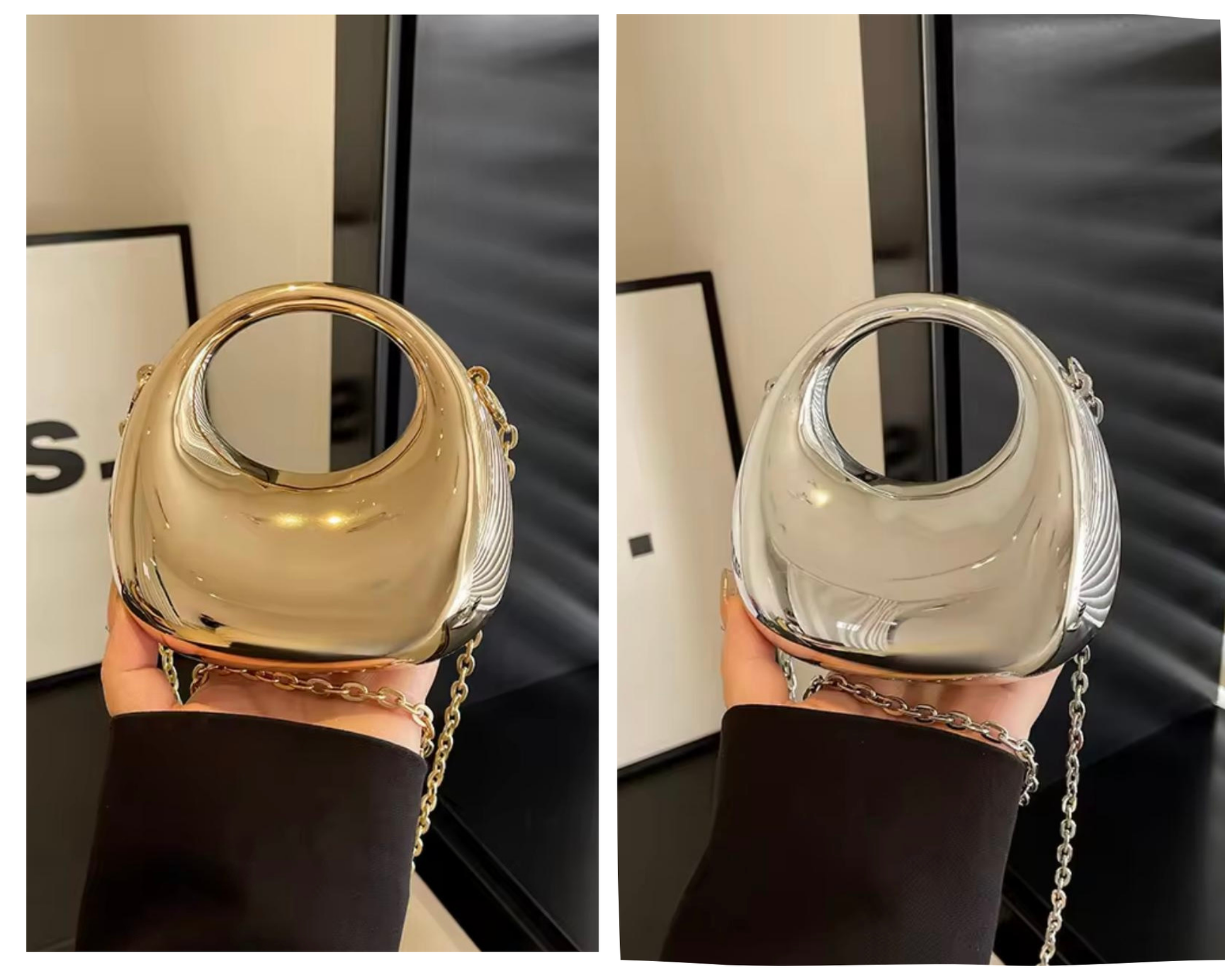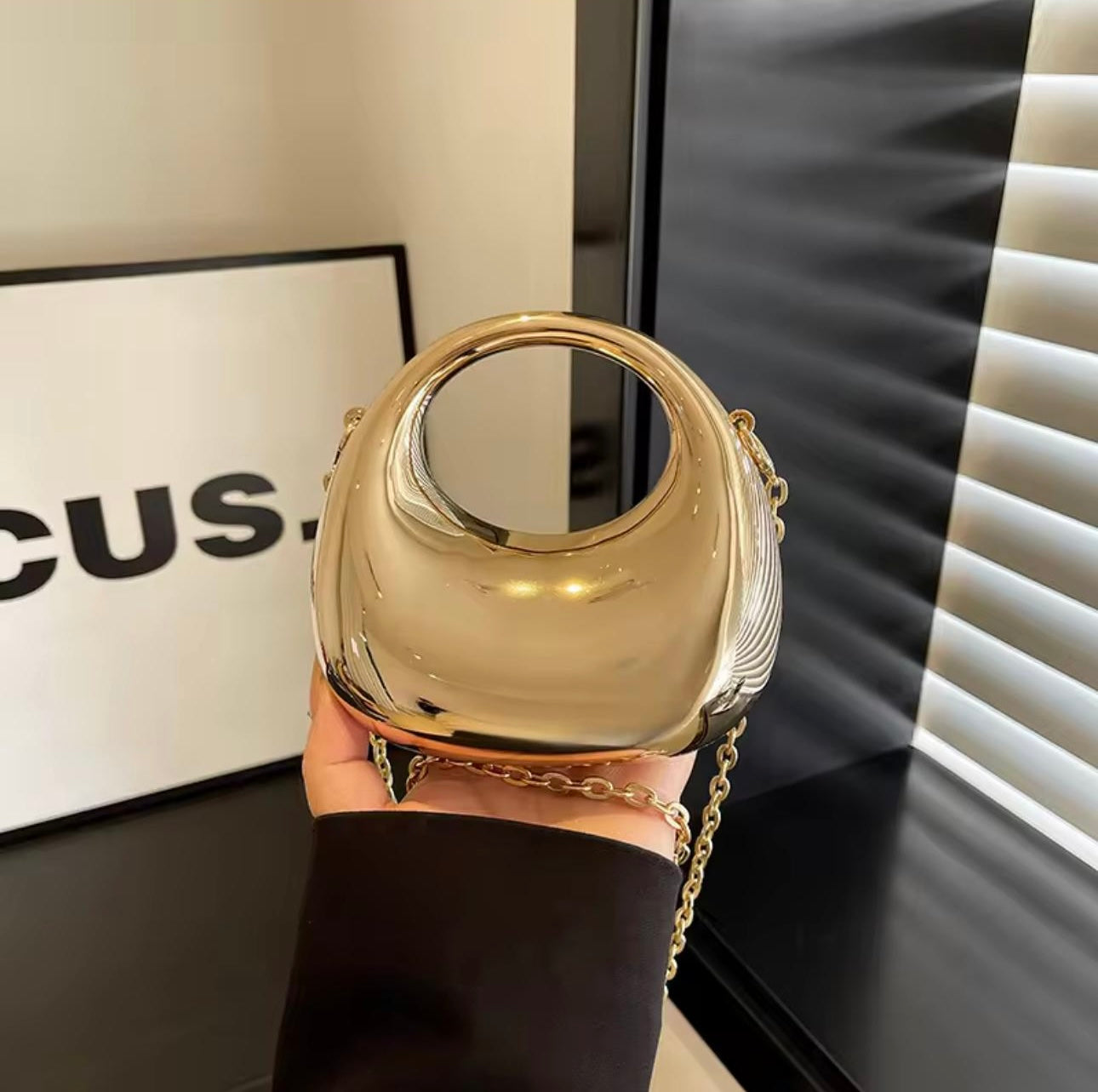 available for immediate delivery. This chic accessory features a unique ring-shaped design with a chain strap, perfect for adding a touch of elegance to any outfit. Choose from two metallic finishes: gold and silver.