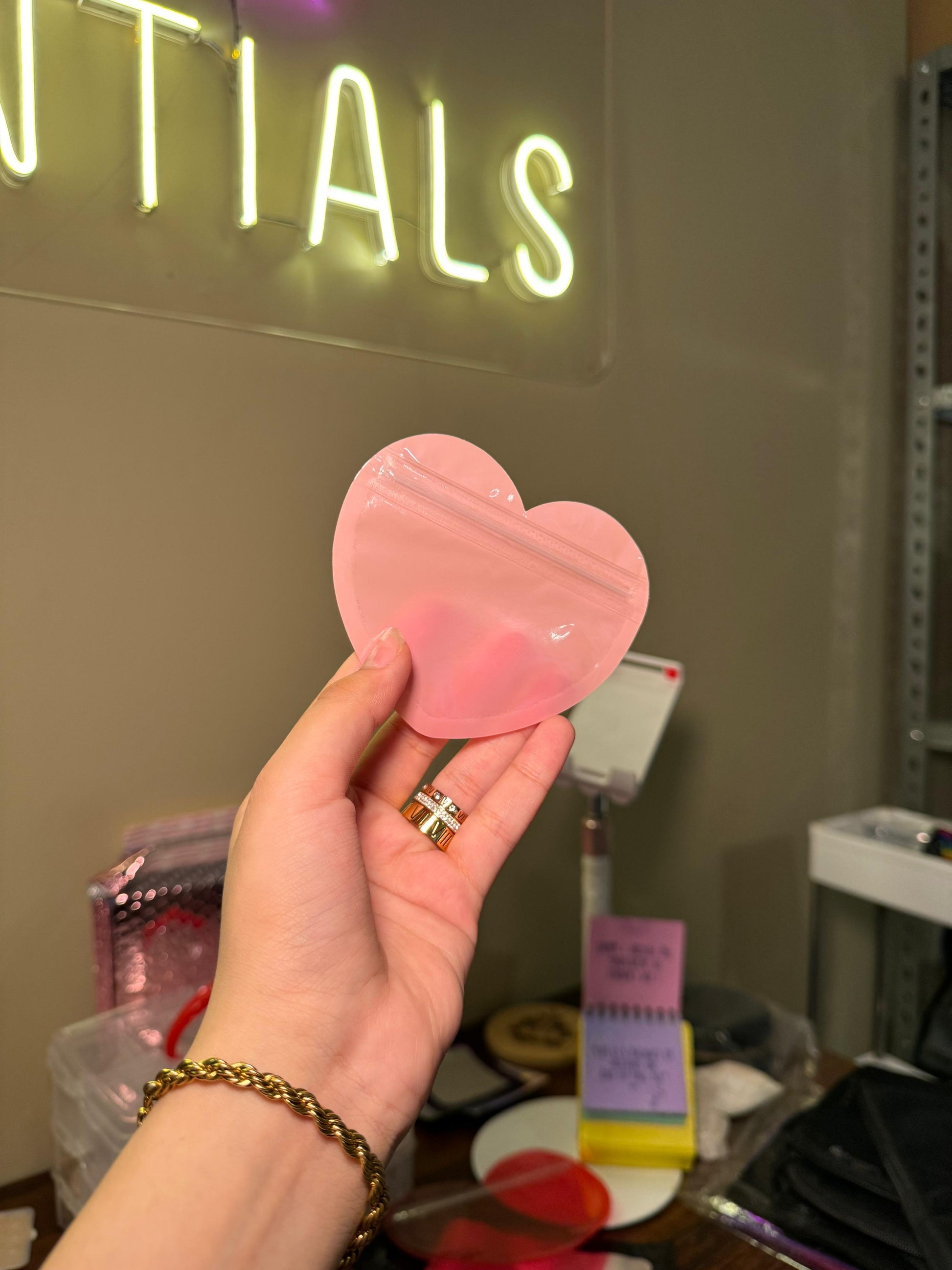 Introducing Pink heart zip lock 8.5x10cm On @labia essentials A Pink heart zip lock 8.5x10cm is a cute and practical small plastic bag with a pink heart design and a zip lock closure. It is typically sized at 8.5x10cm, making it ideal for storing small items such as jewelry, beads, or other tiny treasures. The zip lock feature allows you to securely seal the bag, keeping your items safe and organized. The pink heart design adds a touch of charm to the bag, making it not only functional but also visually appealing. It's perfect for storing and carrying small items in a stylish and convenient way.