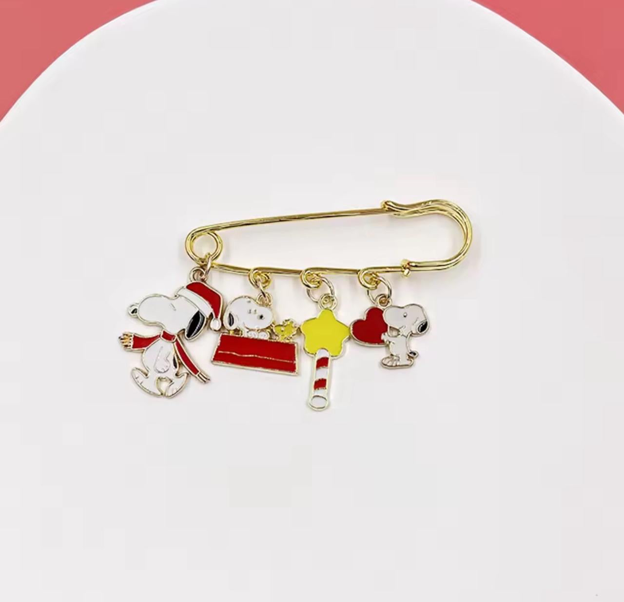 Add a dash of Peanuts charm to your outfit with this adorable Snoopy-themed brooch! 🐶❤️ Featuring five charms hanging from a gold safety pin, this brooch showcases Snoopy in various cute poses and symbols.